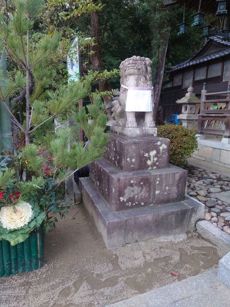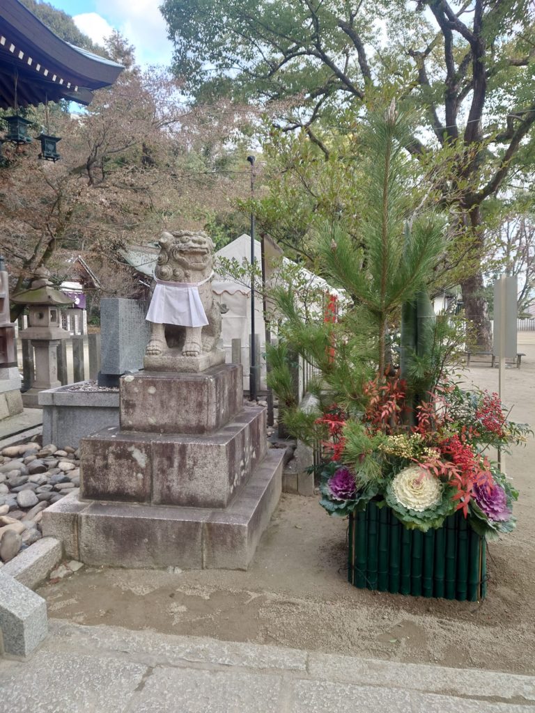 拝殿前の狛犬は、先日奉製された門松と並んで、ひときわ華やかで、新春にふさわしいお姿です。