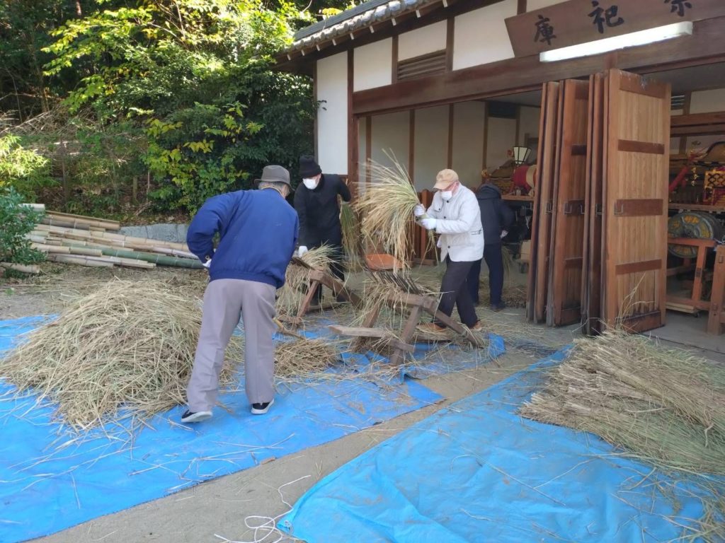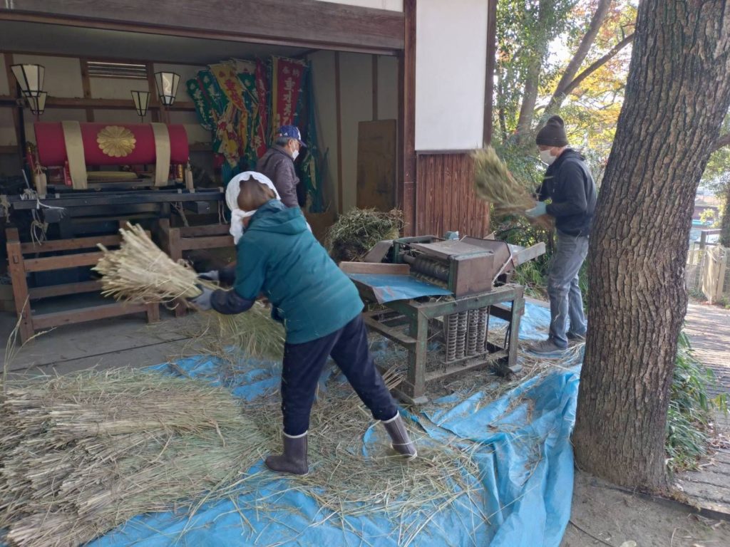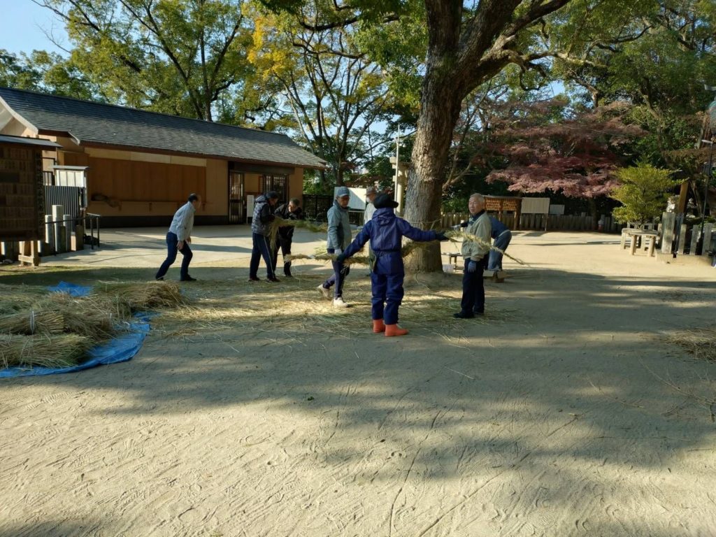 本日9時から、境内の社殿、鳥居、注連柱につける太縄の奉製が行われました。