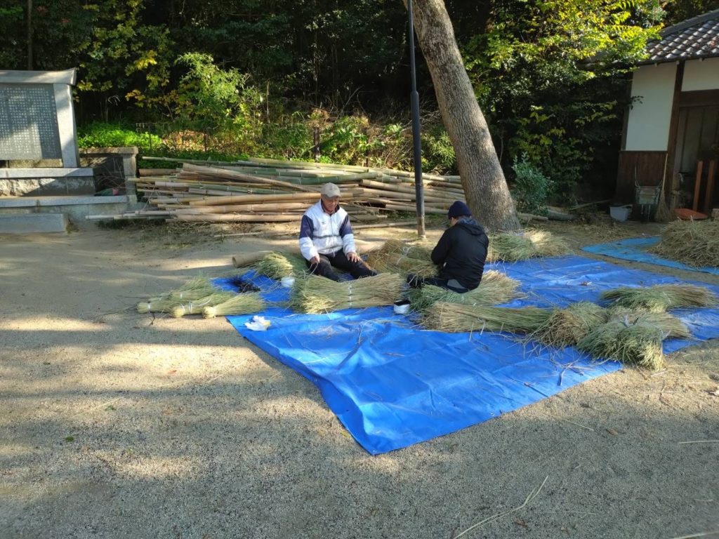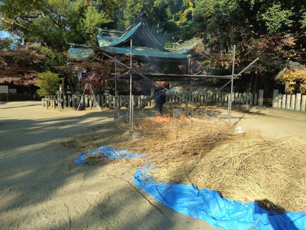 当社は社殿、鳥居の数が多いので、二十数名のみなさまが、縄をなう人、ぼんぼりを作る人、わらを焼く人、縄を固定するための竹を切り出す人、できたしめ縄を各所に取り付けていく人、というふうに分担して作業を進めます。
