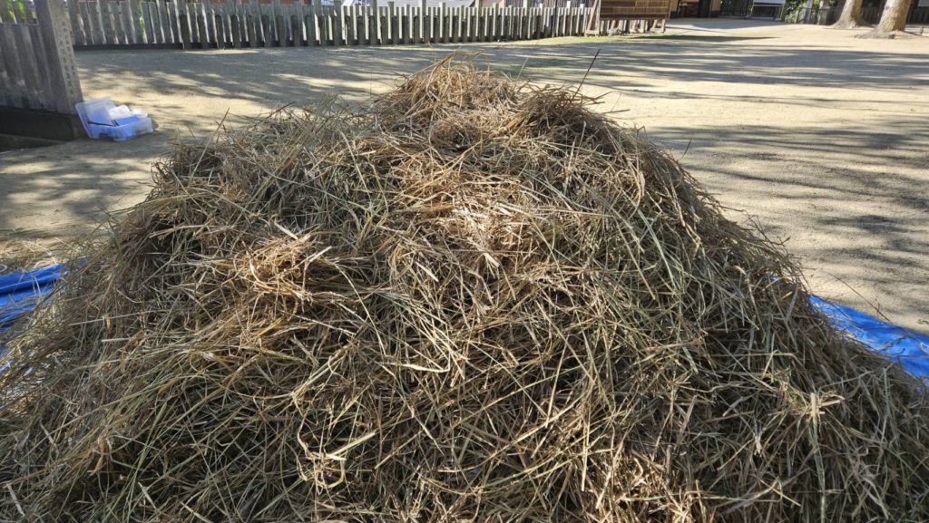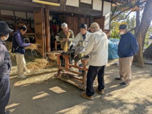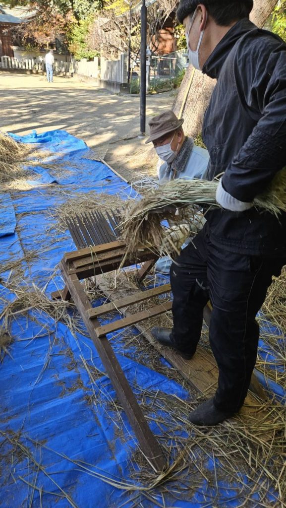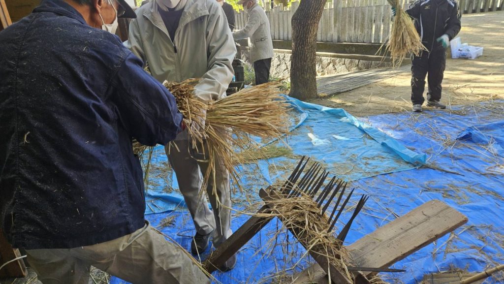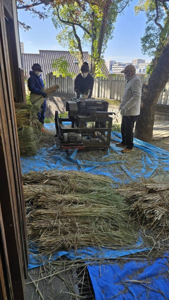 本日午前9時から、しめ縄講のみなさまが、稲わらをたたいたり、すいたりして調製しやすくするための作業をしてくださいました。