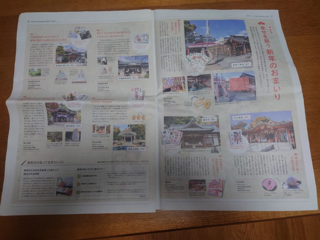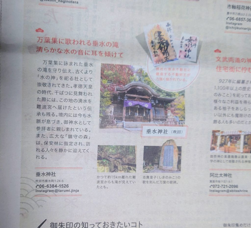 ご朱印と幸せを願う新年のおまいり、というテーマで、各地の神社とともに、当社の拝殿、万葉集歌碑、垂水の滝の写真と神社朱印、垂水不動社特別朱印が紹介されています。