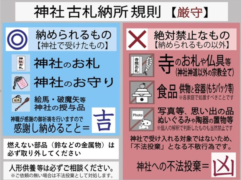 門松奉製の日に、古札納所を拝殿東側広場に設けました。 これに伴い、石段下手水舎横にある通常の古札納所は閉鎖しました。 1月15日のとんど祭まではお札やお守りは、臨時納所に納めてください。 納めて良いもの悪いものは以下の通りです。 共有: Facebook で共有するにはクリックしてください (新しいウィンドウで開きます) Facebook いいね:いいね 読み込み中…